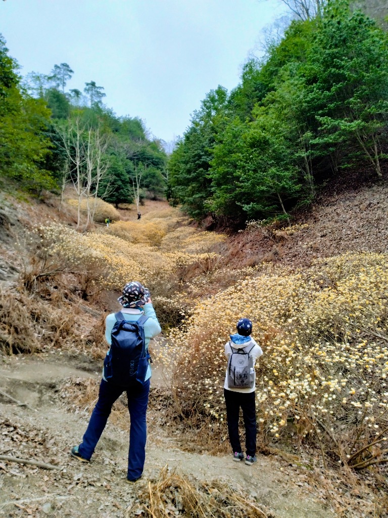 3月下旬、谷を埋め尽くすように咲く黄色いぼんぼりのような花