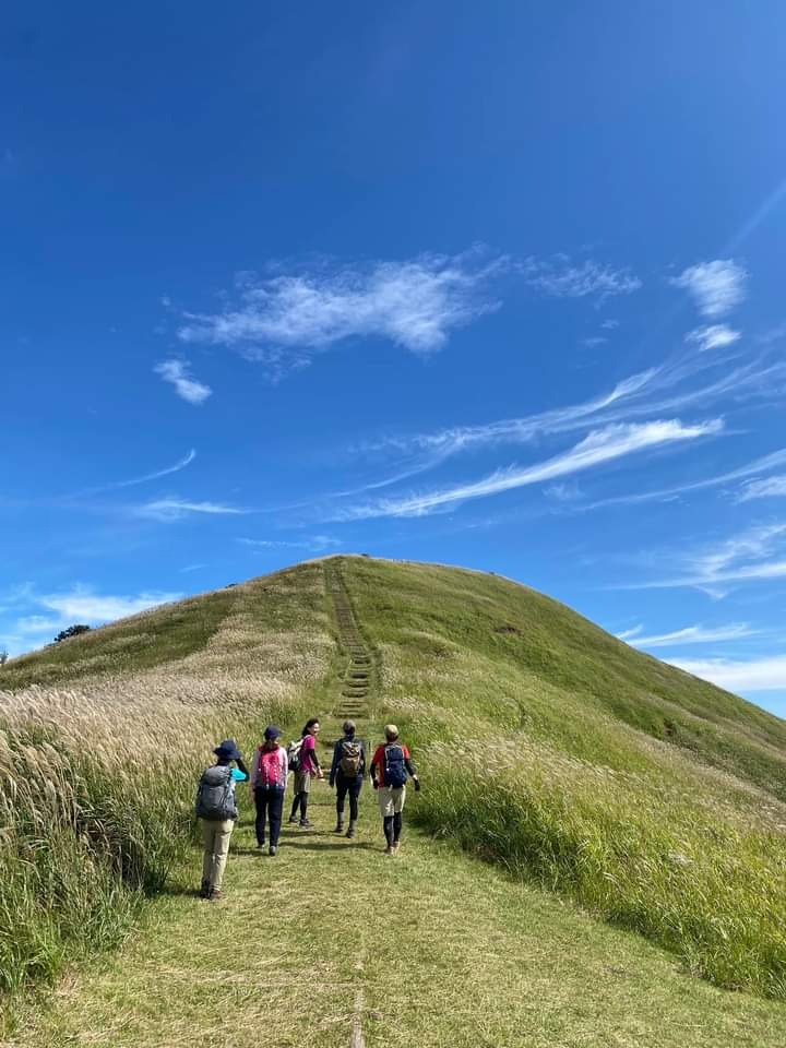 青く澄み切った空の下、日の光に照らされて穂が銀色に輝くススキの一本道を登って、小代越えから最初のビーク、空に続くような高丸山への登りを登ります