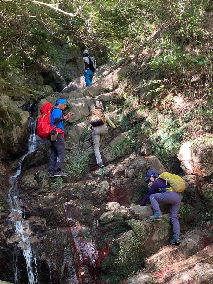 クライミングのテクニックを使いながら、大きな岩や沢の流れの横を登り、大正時代から続くクライミングの岩場「A懸垂岩」に到着