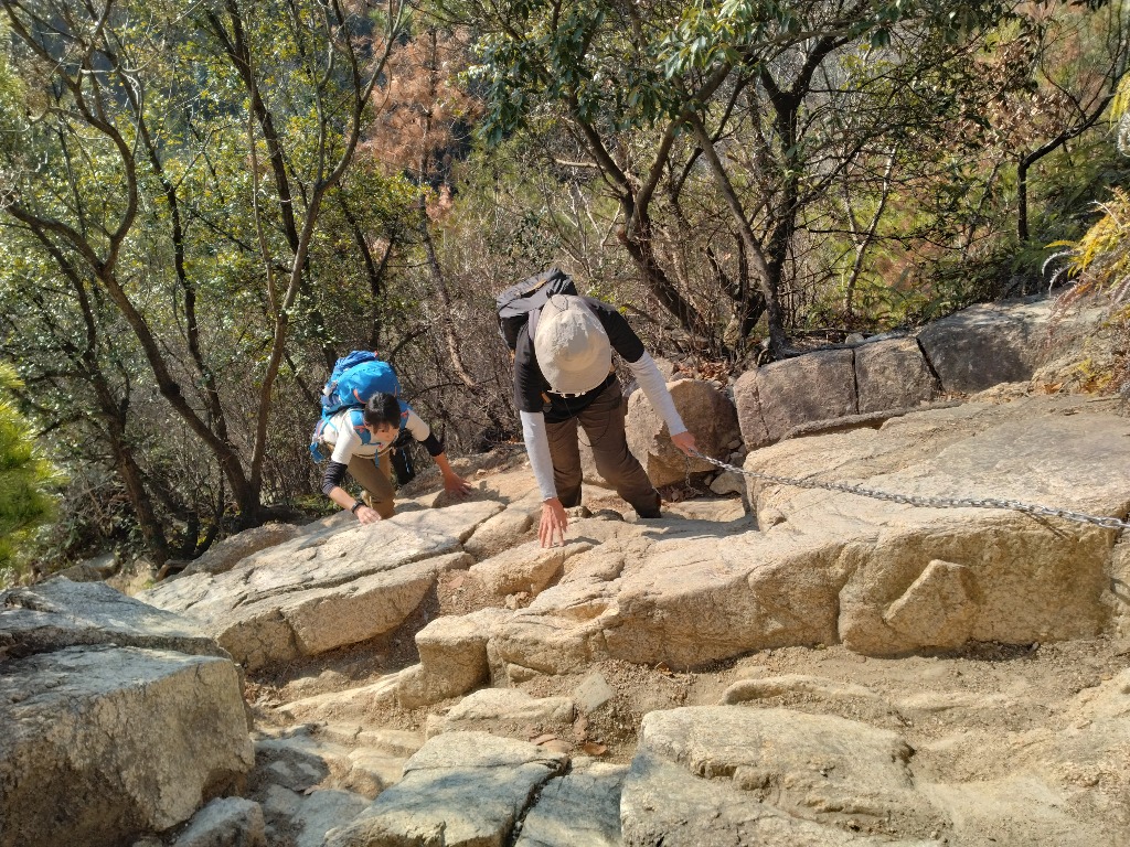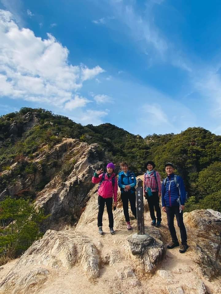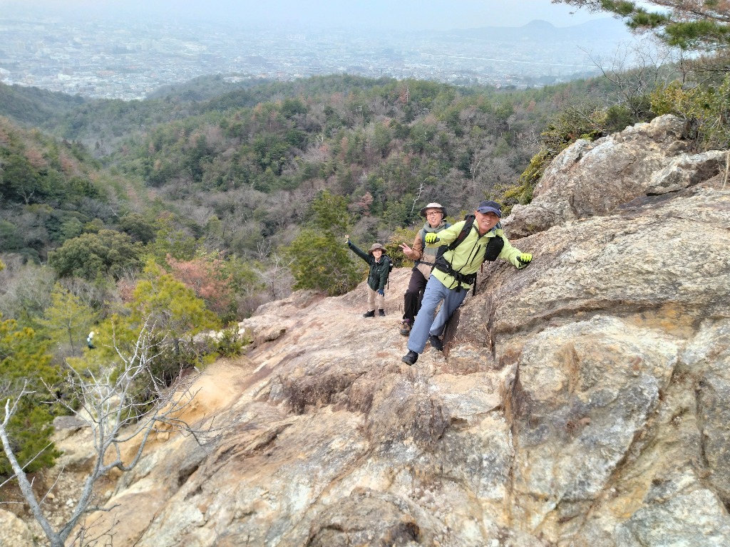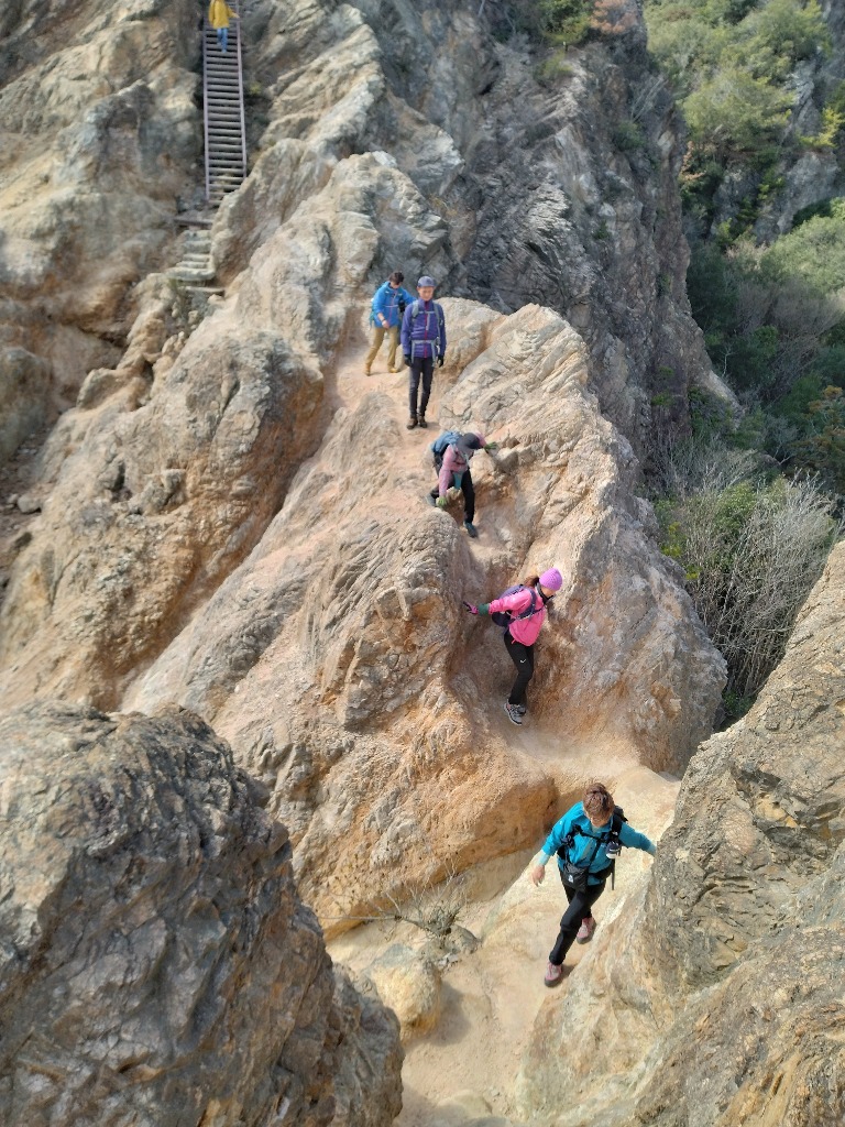 ランチ後はゆっくり再スタートし、神戸槍と呼ばれる横尾山山頂を越えると、徐々に岩場が現れ始め、東山が見える場所まで来ると、鞍部にある風化した花崗岩の荒々しい痩せ尾根、須磨アルプス馬の背が見えてきます