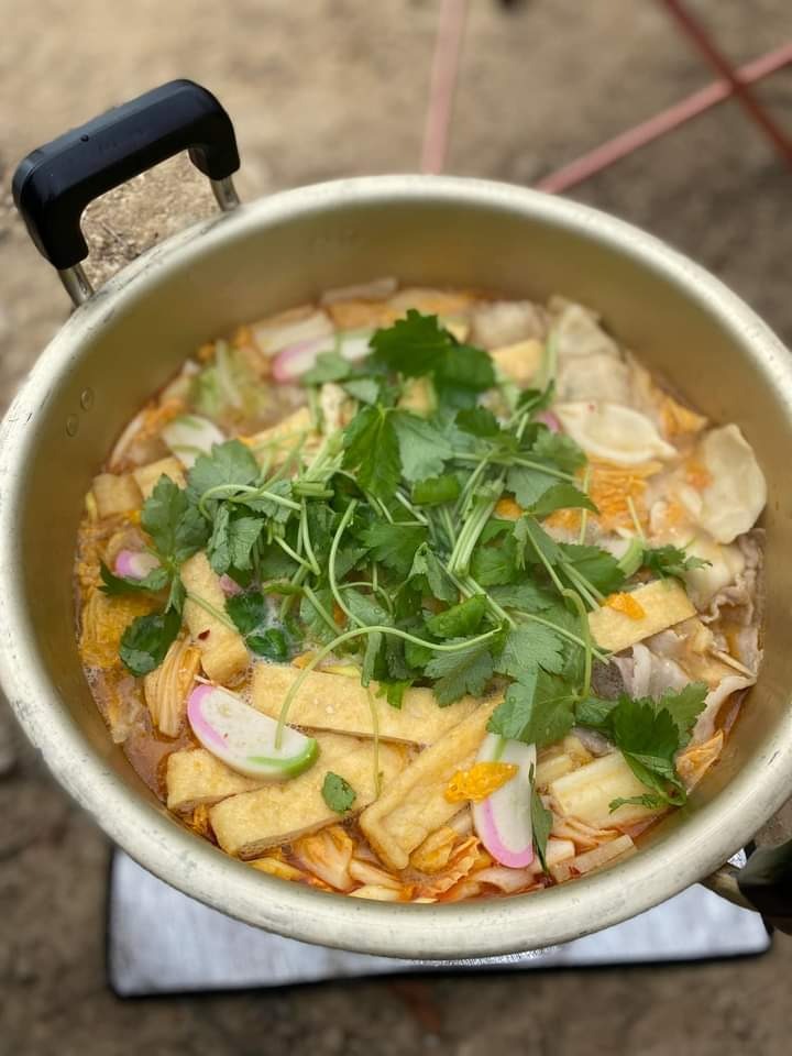 今回の山ごはんは、にんにくの効いた赤味噌仕立ての豚味噌鍋