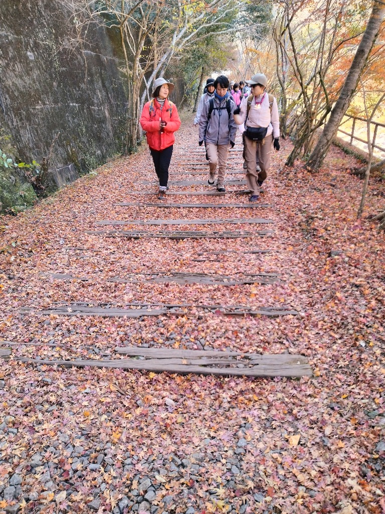 紅葉が見頃になった谷の景色を見ながら、モミジの落ち葉で赤く彩られた枕木の上を歩いて、いつものランチポイントへ