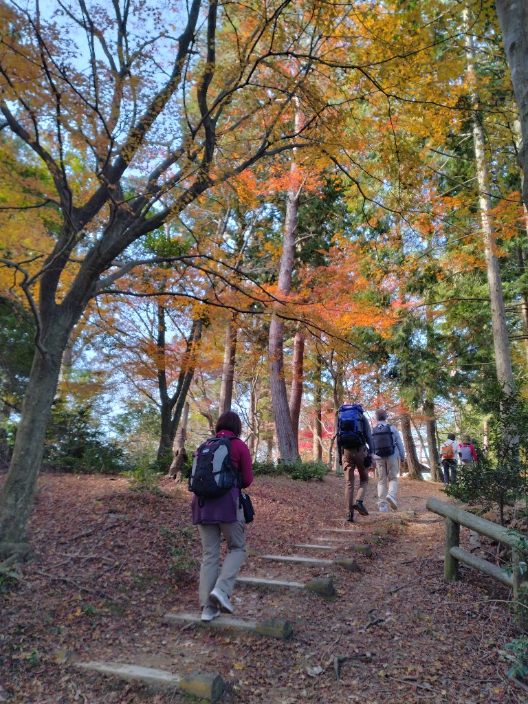 時折急な登りもある山道を進み、紅葉に囲まれたようらく台の四阿でひと休憩
