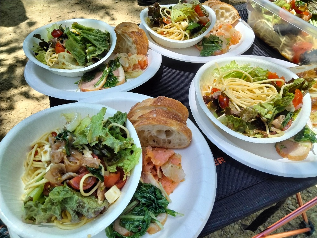 今日の山ごはんは、生ハムとトマトとバジルの冷製パスタ、北欧風オープンサンド
