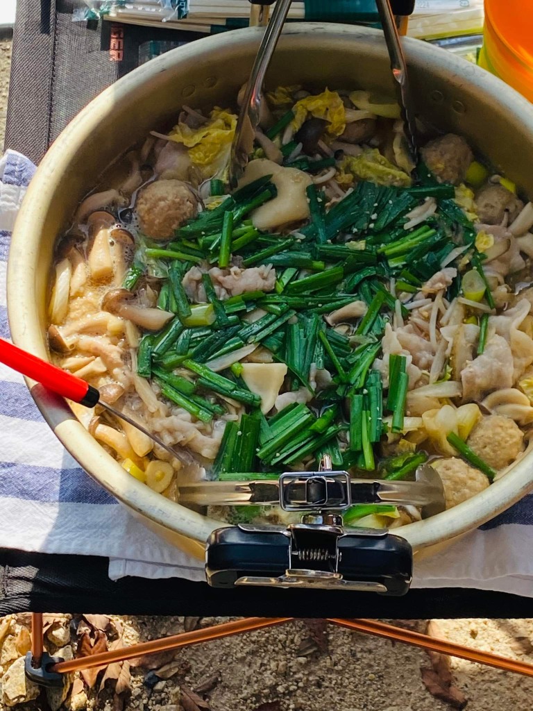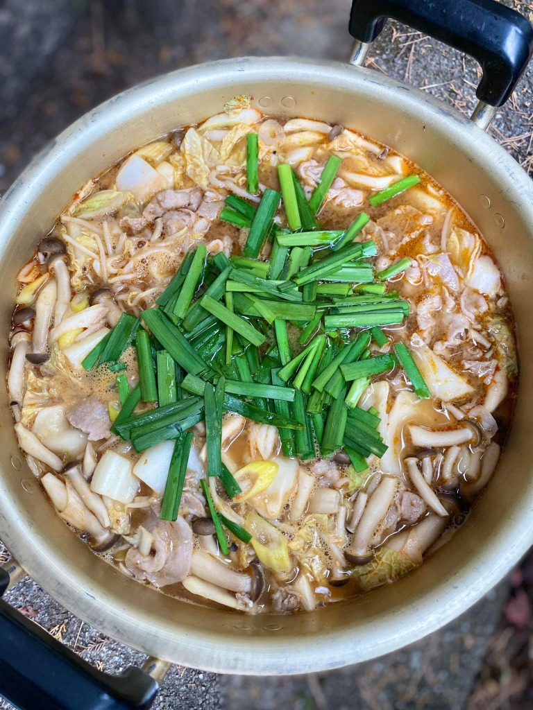 今日の山ごはんは、今年の新作、ニンニクを効かせた赤味噌仕立ての豚味噌鍋