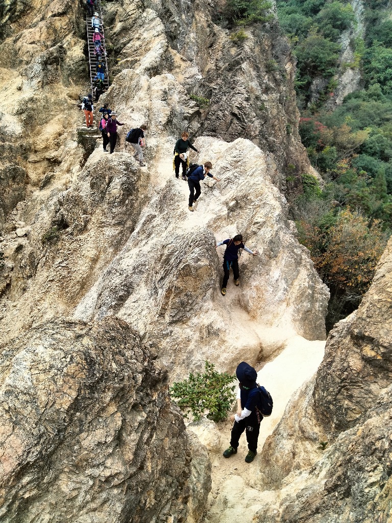 難しい岩場ではありませんが、岩場ゆえに慎重に歩を進め、コース核心部、両岸の切り立った狭い馬の背を渡り、最後の登りを登り切ると、七つ目の山、東山の山頂に到着