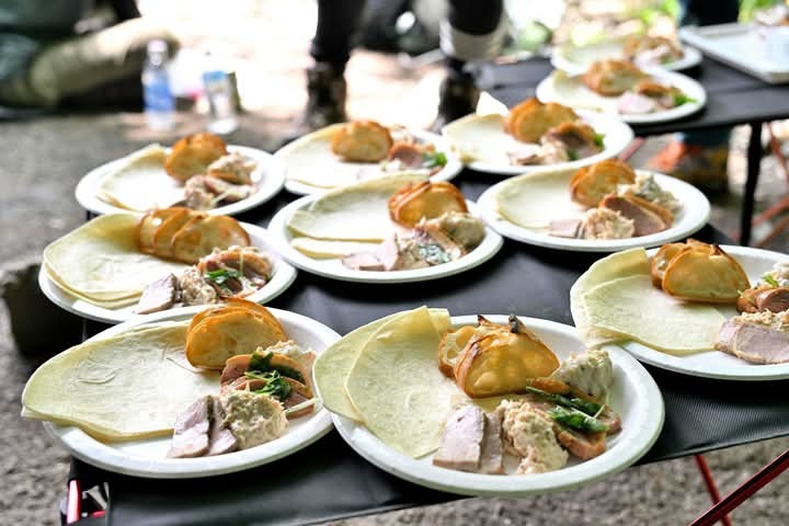 今日の山ごはんは、生ハムとトマトとバジルの冷製パスタ、野菜サラダ、オードブルが鴨のブルスケッタ、チキンのレモンペッパー風味、明太子ポテトサラダ