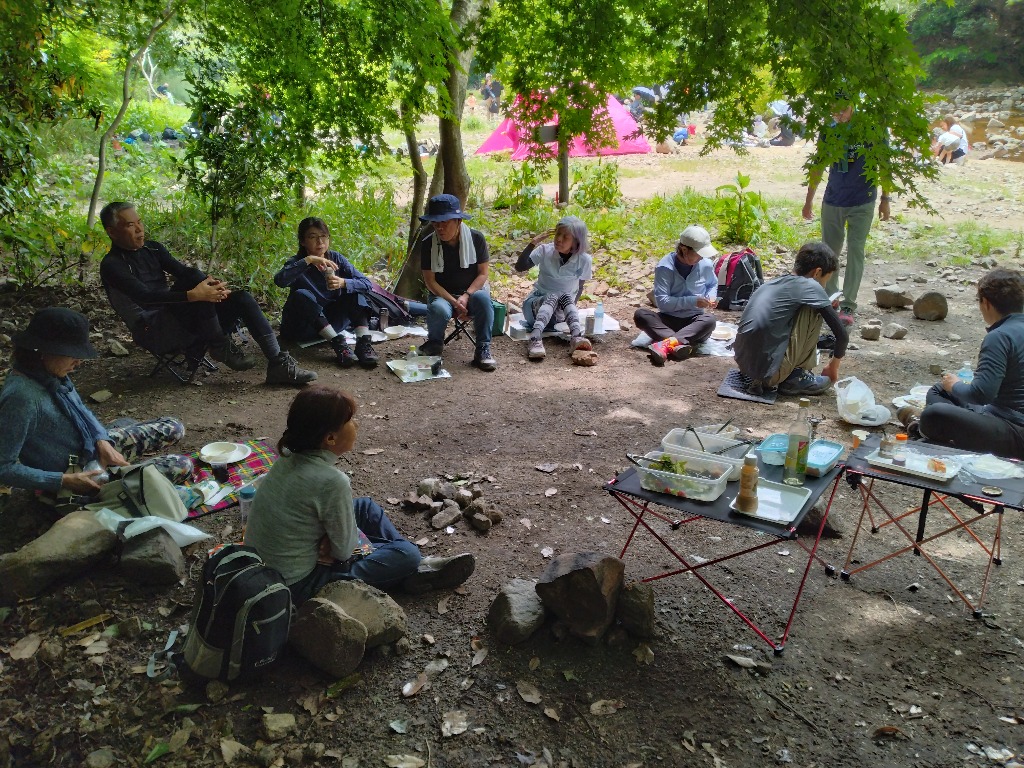 山の中の広々とした河原で、沢が流れていて、涼しくとてものんびりできる場所です