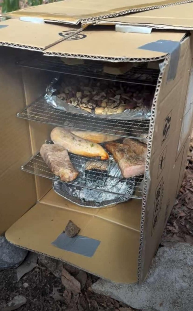 お手製の段ボールスモーカーを組み立てて、網の上に食材を乗せて、スモークウッドとチップを燻したら蓋を占めて、あとは時間に任せるだけ